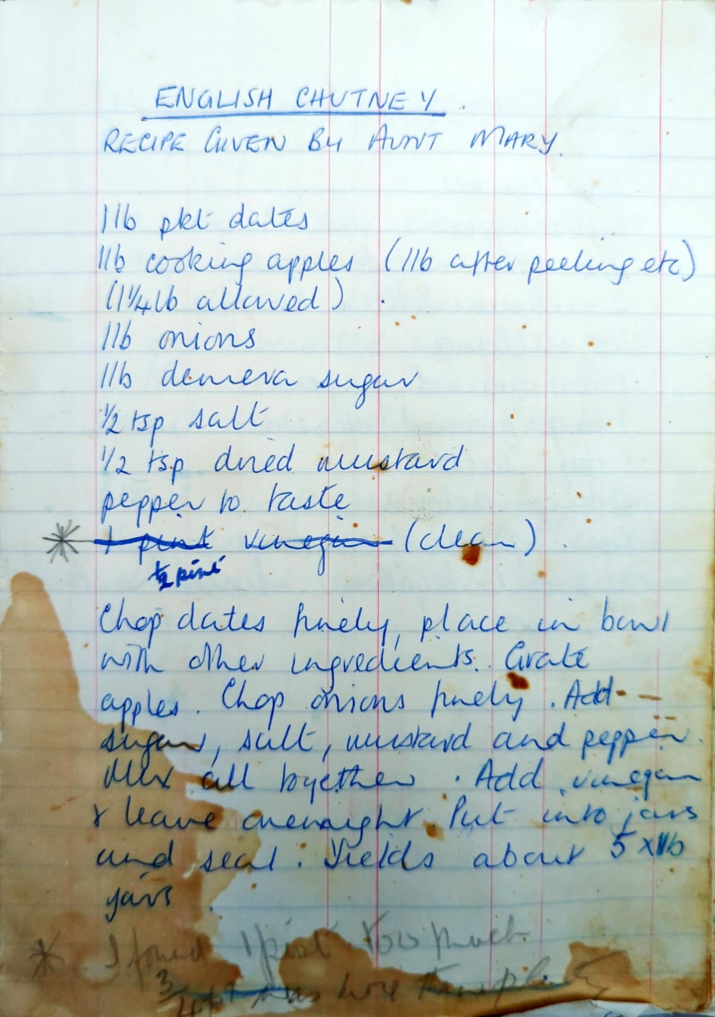1 lb pickled dates 1 lb cooking apples (after peeling) 1 lb onions 1 lb demerara sugar 1/2 teaspoon salt 1/2 teaspoon dried mustard pepper to taste 1/2 pint vinegar