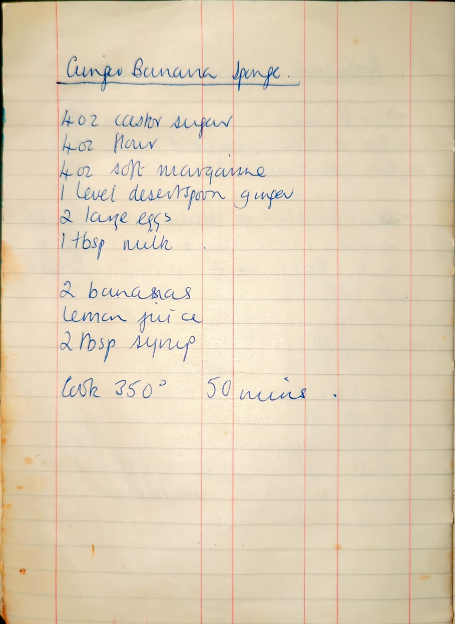 4oz caster sugar 4oz flour 4oz soft margarine 1 level desert spoon of ginger 2 large eggs 1 tablespoon of milk 2 bananas Lemon juice 2 tablespoons of syrup