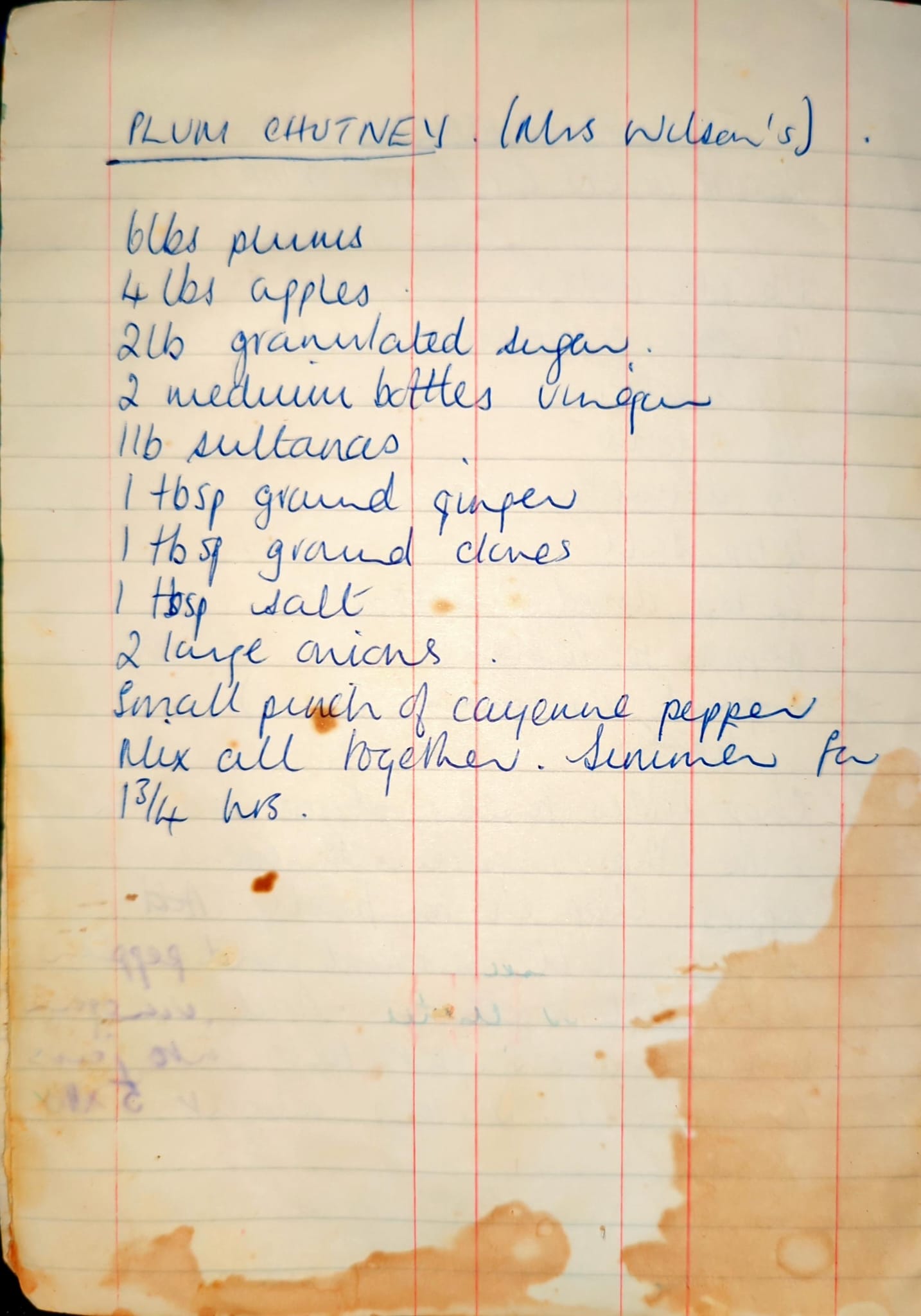 6 lb plums 4 lb apples 2 lb granulated sugar 2 medium bottles of vinegar 1 lb sultanas 1 tablespoon ground ginger 1 tablespoon ground cloves 1 tablespoon salt 2 large onions Small pinch of cayenne pepper