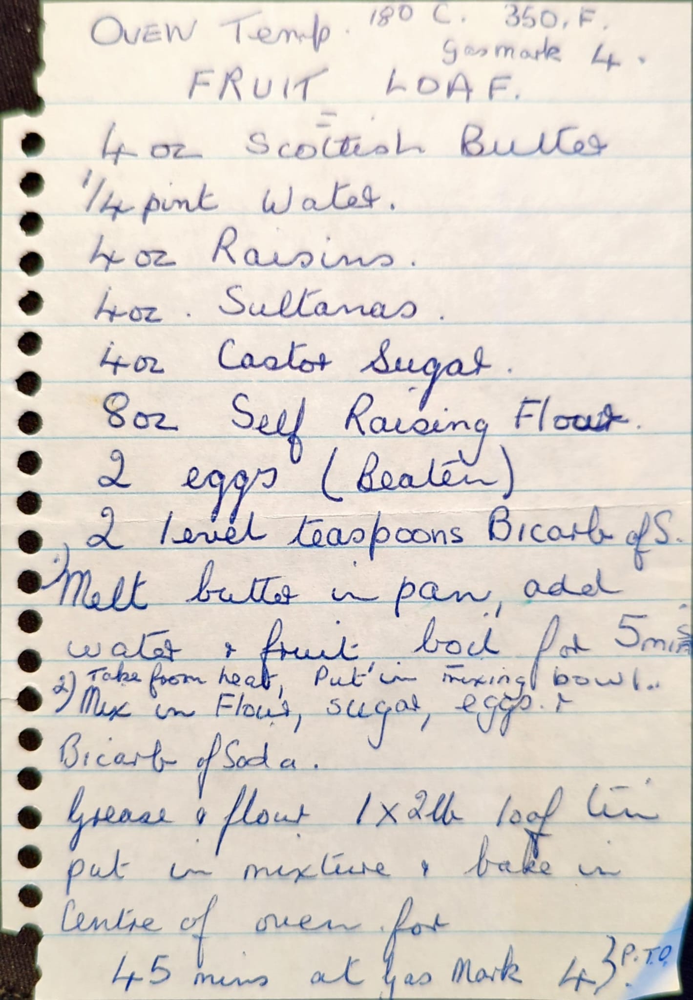 4oz Scottish Butter 1/4 pint water 4oz Raisins 4oz Sultanas 4oz Caster Sugar 8oz Self Raising Flour 2 eggs (beaten) 2 level teaspoons bicarbonate soda