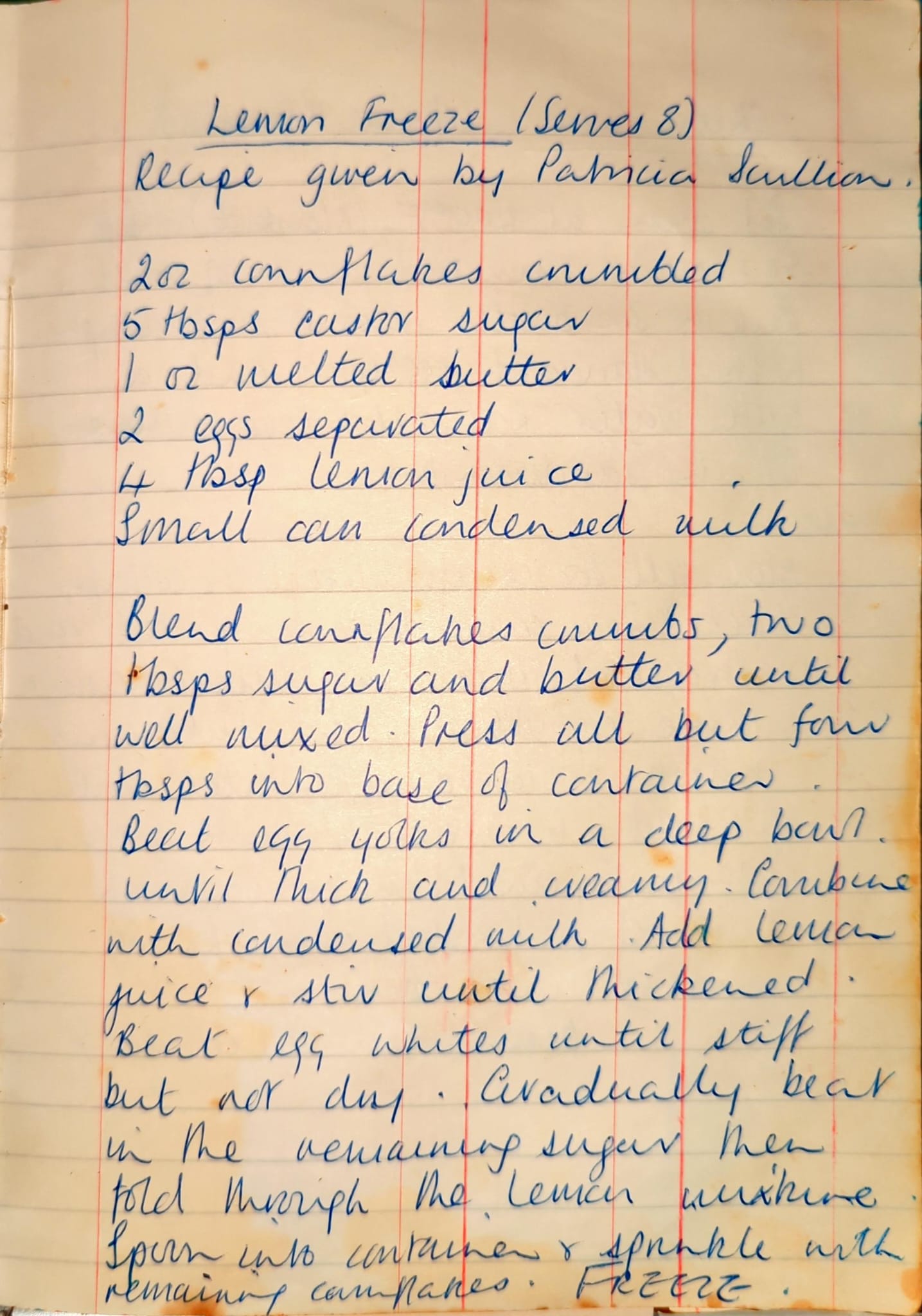 Blend cornflake crumbs, two tablespoons sugar and butter until well mixed Press all but four tabllespoons into base of container Beat egg yolks in a deep bown until thick and creamy Combine with condensed milk Add lemon juice and stir until thickened Beat egg whites until stiff but not dry Gradually beat in the remaining sugar then fold through the lemon mixture Spoon into container and sprinkle with remaining cornflakles Freeze